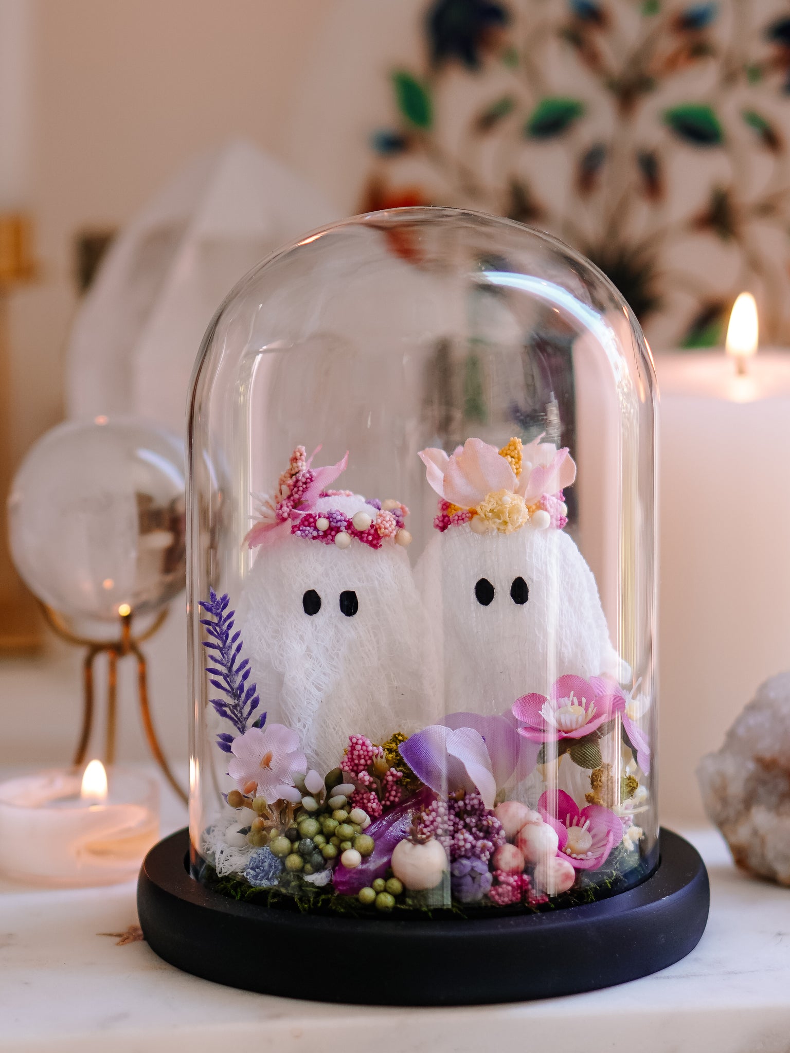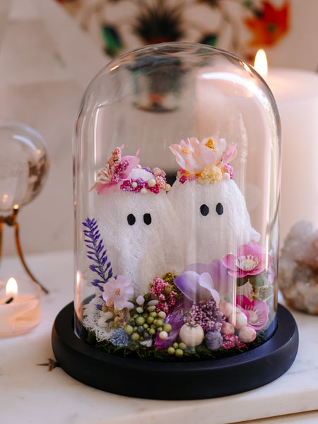 Inspired by the haunting beauty of Midsommar, this one-of-a-kind cloche captures the spirit of the May Queen in ghostly form. Each ethereal figure is delicately adorned with a flower crown and encased in a glass dome, surrounded by natural moss, soft faux florals, and enchanted details.