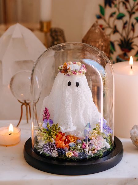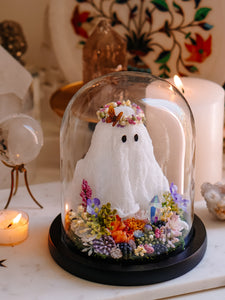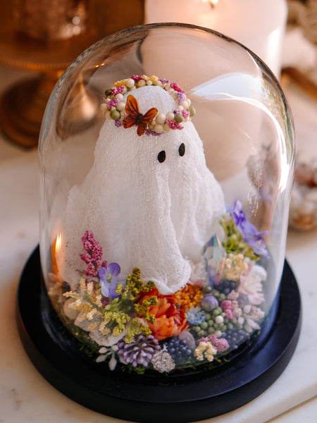 Inspired by the haunting beauty of Midsommar, this one-of-a-kind cloche captures the spirit of the May Queen in ghostly form. Each ethereal figure is delicately adorned with a flower crown and encased in a glass dome, surrounded by natural moss, soft faux florals, and enchanted details.