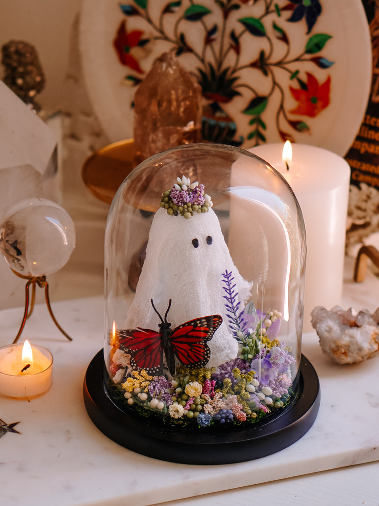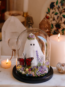 Inspired by the haunting beauty of Midsommar, this one-of-a-kind cloche captures the spirit of the May Queen in ghostly form. Each ethereal figure is delicately adorned with a flower crown and encased in a glass dome, surrounded by natural moss, soft faux florals, and enchanted details.